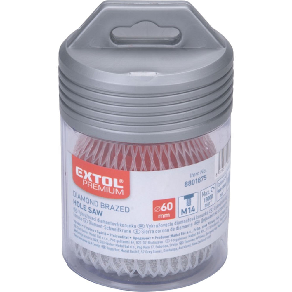 A 60 mm‑es EXTOL Premium körkivágó gyémánt vágóéllel egy igazán sokoldalú és megbízható eszköz, ami mindenki számára ideális, aki sarokcsiszolóval dolgozik csempén, téglán, pórusbetonon vagy hasonló anyagokon. Ez a körkivágó nem csupán strapabíró – a festett acél alap és a 15 mm széles gyémánt szegmens (P35‑40 szemcseméret) gondoskodik róla, hogy hosszú életű maradjon még intenzív használat során is. Az M14‑es menetes befogó könnyedén illeszthető bármilyen sarokcsiszolóhoz, és nem igényel külön hűtést sem, mégis biztonságosan használható akár 13 000 ford/perc maximális fordulatszámmal – vagyis nem kell vízzel vagy olajjal bajlódnod, csak dolgozhatsz.