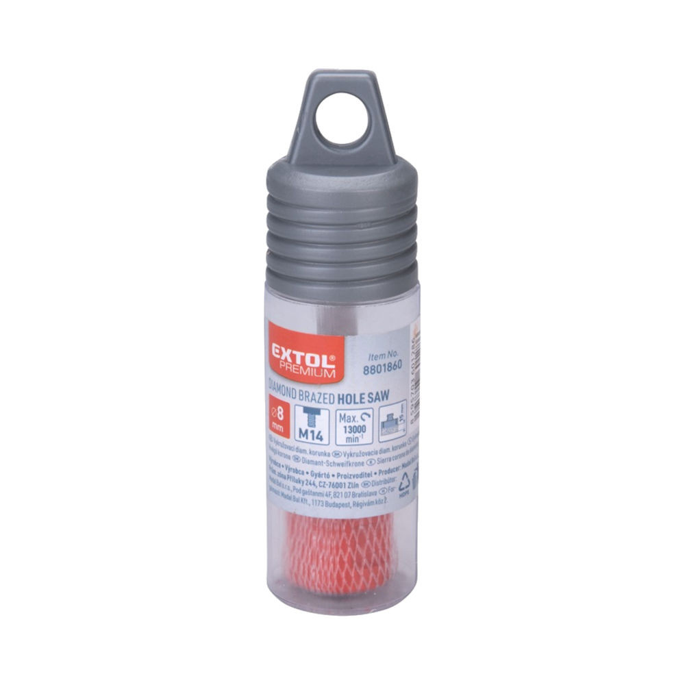 Ez a 8 mm × M14 EXTOL PREMIUM körkivágó csempére gyémánt vágóéllel pont az, amire szükséged lehet, ha precíz és tiszta körlyukakat szeretnél csempében, téglában vagy pórusbetonban. A gyémánt bevonatú vágószegmens – kb. 15 mm magas, P35‑40 szemcsemérettel – különösen hatékony kemény felületeken is. A befogó menete M14‑es, vagyis könnyen rászerelhető a sarokcsiszolóra, amely akár hűtés nélkül is használható – de mindig érdemes vízzel vagy spray‑vel segíteni a vágás hűtését a hosszabb élettartam érdekében.