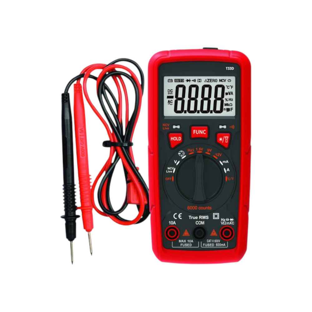 A T33D multiméter rendelkezik diódateszt funkcióval, hangjelzéssel támogatott folytonosságvizsgálattal, valamint hőmérsékletmérő bemenettel, így a mellékelt vagy kompatibilis hőmérő szondával akár széles hőmérséklet-tartományban is végezhetünk méréseket. A HOLD funkció segítségével az aktuális mérési eredmény „megfagyasztható” a kijelzőn, ami megkönnyíti a nehezen leolvasható pozíciókban történő munkát. Az automatikus kikapcsolás csökkenti az elemhasználatot, míg az alacsony töltöttség jelzése időben figyelmeztet az elemcserére.