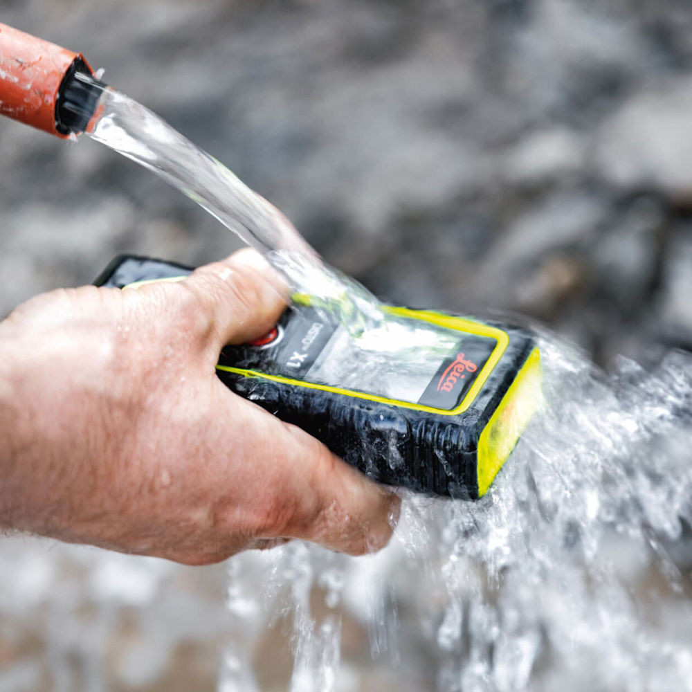 A Leica DISTO X1 a gyártó „tough interior” kategóriájának tagja, vagyis kifejezetten olyan beltéri építkezésekhez, felújításokhoz, szerelési munkákhoz készült, ahol a műszernek napi szinten kell elviselnie a mechanikai igénybevételt, port, nedvességet és gyakori szállítást. A gumírozott, üvegszállal erősített műanyag ház 2 m-es ejtéstesztet teljesít, így állványokról, létráról való leejtés után is megőrzi pontosságát, ami a szakipari használatban kiemelt szempont. IP65 védettségének köszönhetően por- és vízálló, nedves, frissbetonos, csempézett vagy akár vízzel tisztított környezetben is biztonsággal alkalmazható, a gyártó kifejezetten említi a víz alatti tisztíthatóságot.