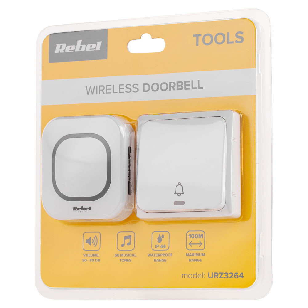 A Rebel URZ3264 stílusos, fehér kivitelű kinetic vezeték nélküli csengő ami azonnal használható hálózati dugóval, nincs szükség bonyolult szerelésre. 58 különböző dallam közül választhat, a hangerőt 4 fokozatban állíthatja 50-80 dB között, így tökéletesen illeszthető a otthoni igényekhez, akár csendes éjszakára vagy hangosabb nappalra. A 433,92 MHz-es frekvencia és max. 10,97 dBm teljesítménynek köszönhetően 150 m-ig terjed a hatótávolság nyílt területen, ideális családi házakhoz vagy nagyobb telkekhez, falak ellenére is megbízhatóan működik. IP44-es védettsége ellenáll az időjárásnak, pornak és fröccsenő víznek, így kültéren a bejáratnál is elhelyezhető anélkül, hogy károsodna. Kiemelkedő energiahatékonysága alacsony fogyasztással jár, stabil AC 110-220V / 50-60 Hz tápellátással, nincs elemcserére szükség a főegységnél. A vezeték nélküli nyomógomb különlegessége, hogy semmilyen áramforrást nem igényel, egyszerűen felszerelhető ragasztóval vagy csavarral a kapura vagy ajtóra, azonnal aktiválódik párosítás nélkül. Praktikus mindennapi használatra, alacsony karbantartást igénylő, modern megjelenés, ami illik bármelyik házhoz vagy lakáshoz, növelve a kényelmet vendégek fogadásakor.